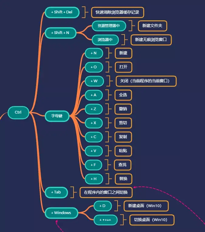 常规情况中最常见的就是 Ctrl 直接组合字母键,可以说上图列举的字母组合最好每个人都能记下来。其中,Ctrl+W 可以关闭当前程序的当前窗口是很多人都容易忽略的。