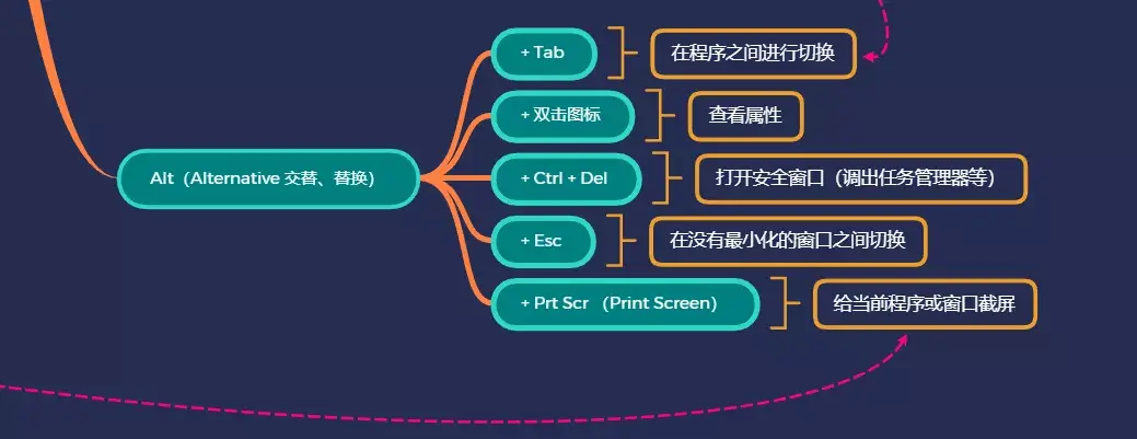 Alt 全拼为 Alternative,意思是交替、替换。一般情况下,它并不单独具有意义,和其他的快捷键组合在一起,就有了相关的功能。