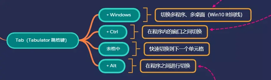 Tab 全称是Tabulator ,也就是跳格键。和其他快捷键的组合意义在以上内容中已经讲得差不多了。