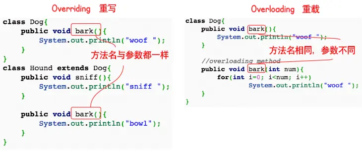 - (2)方法重写是在子类存在方法与父类的方法的名字相同,而且参数的个数与类型一样,返回值也一样的方法,就称为重写(Overriding)。