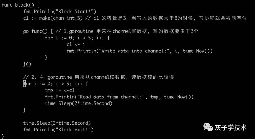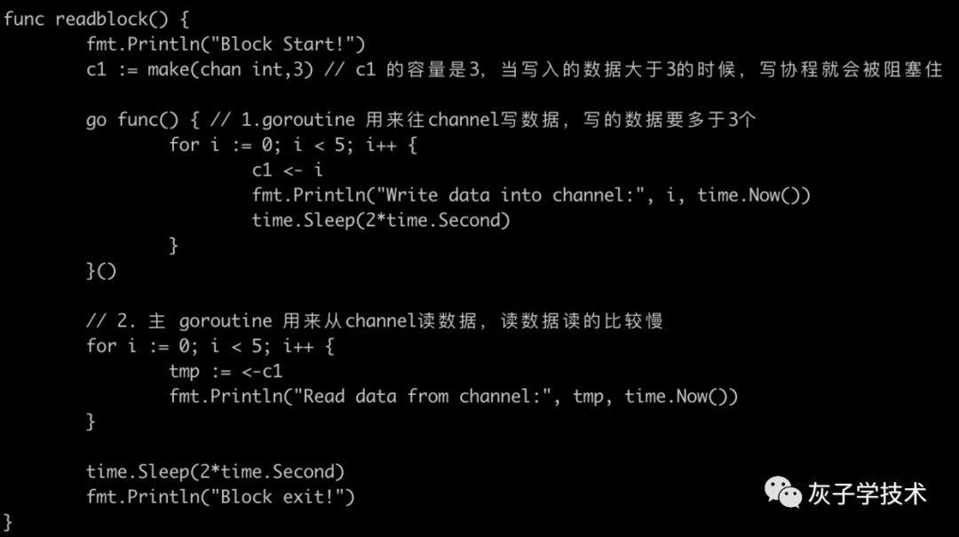 从输出的结果来看,读数据的协程都得延迟2s才能读出来,而在这2s内,读数据协程是被阻塞的。