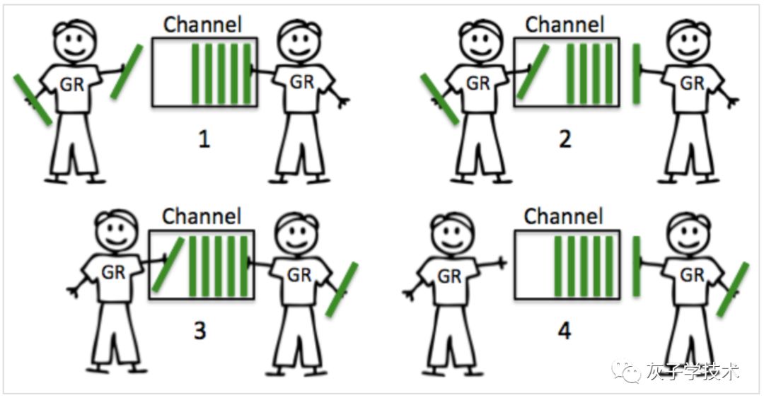 从交互图可以看出,两个协程在交互数据的时候,都是通过channel来完成,只要channel没有被填满或者为空,两个协程就可以不停的往里面读写数据,不会发生阻塞。