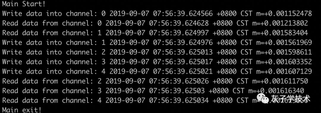 从输出可以看出,读数据协程和写数据的协程,读写数据的时间都很顺畅,并没有出现阻塞。(备注:因为是两个协程,所以打印的顺序会显得有些不正常。不过不用担心,它们的正常处理过程是写数据协程先写数据,读数据协程才会读数据。 )