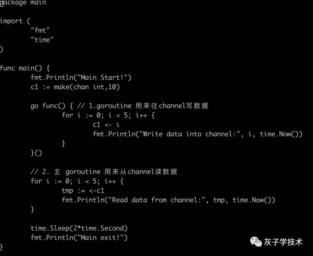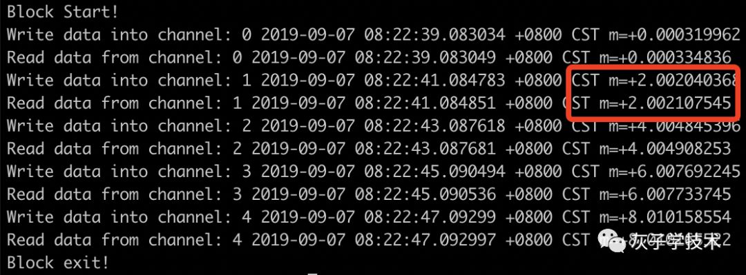 从输出可以看出,goroutine1在写0,1,2的时候,是间隔2秒的,这说明channel在上一次数据没有被读出之前是被阻塞的。(备注:输出里面有一点比较奇怪,先打印写,再打印读,这个是因为打印并不保证同一时间不同goroutine的log顺序。)