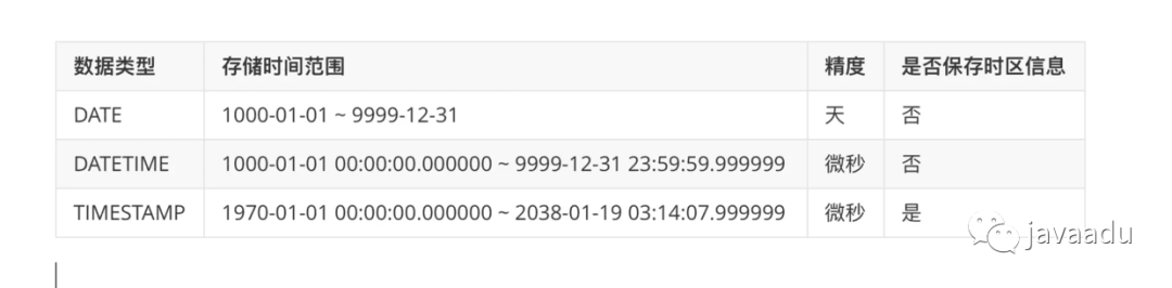 MySQL中用来表示时间的字段类型有:DATE、DATETIME、TIMESTAMP,它们之间有相同点,各自也有自己的特性,我总结了一个表格,如下所示: