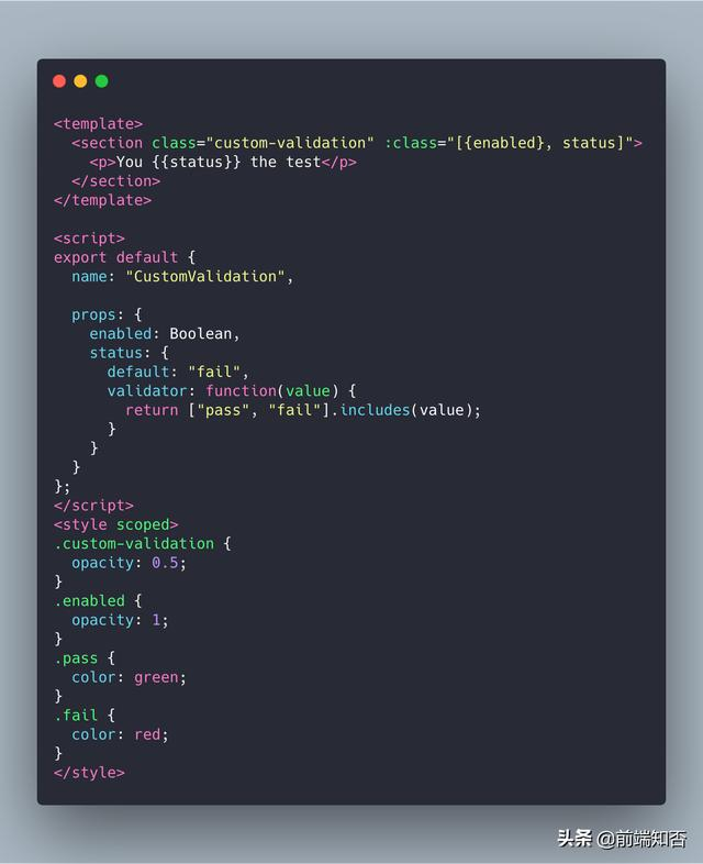 对于更复杂的验证,我们可以将函数传递给validator属性,该属性接收 prop值 作为参数并返回true或false。这非常强大,因为它允许我们针对传递给该特定属性的值编写自定义验证。
