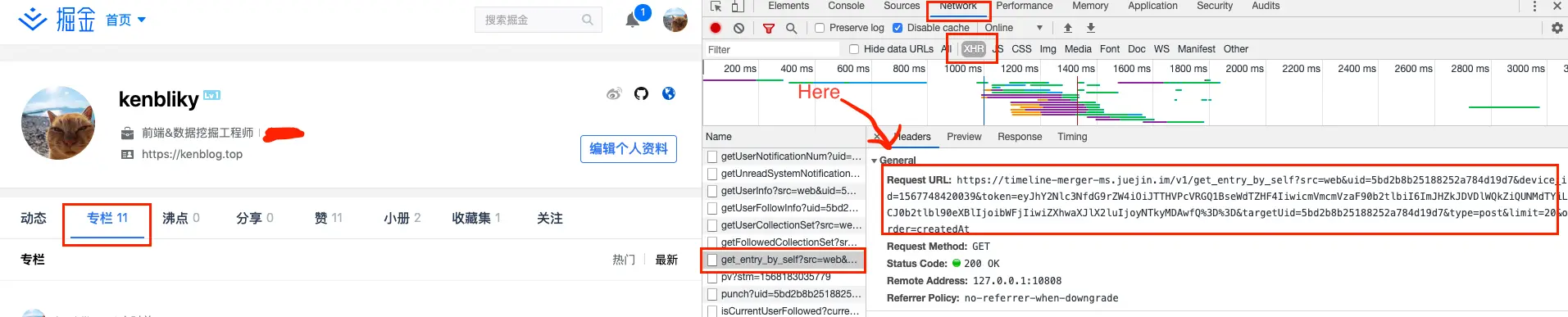进入掘金个人主页,打开开发者工具,点击“专栏” tab ,在开发者工具"Network->XHR->Name->get_entry_by_self->Headers->Request URL" 复制 url。