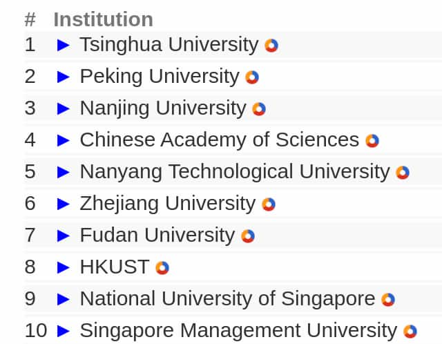 该网站提供计算机科学各领域研究机构的排名,可以查看全球排名,也可以查看每个大洲的排名。上图是亚洲人工智能研究机构的排名。