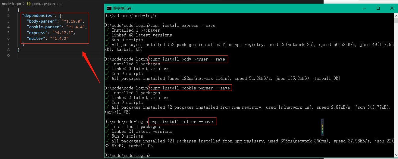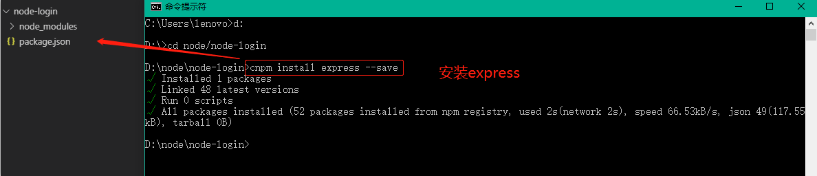 打开cmd命令行,定位到项目目录,使用命令行cnpm install express --save