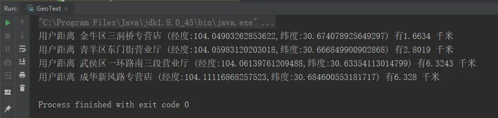 public class GeoTest { public static void main(String[] args) { //连接本地的 Redis 服务 Jedis jedis = new Jedis("localhost"); //初始化4个门店的位置 Map<String, GeoCoordinate> map=new HashMap<>(); map.put("成华新风路专营店",new GeoCoordinate(104.11117,30.6846)); map.put("青羊区东门街营业厅",new GeoCoordinate(104.05983,30.66685)); map.put("武侯区一环路南三段营业厅",new GeoCoordinate(104.0614,30.63354)); map.put("金牛区三洞桥专营店",new GeoCoordinate(104.04903,30.67408)); jedis.geoadd("shop",map); GeoRadiusParam param=GeoRadiusParam.geoRadiusParam() .withDist()//返回距离 .withCoord() //返回经纬度 .sortAscending();//根据距离升序排序; double userLongitude=104.045181;//用户的经度 double userLatitude=30.688663;//用户的纬度 //查询距离用户10公里范围内的营业点 List<GeoRadiusResponse> shop = jedis.georadius("shop", userLongitude, userLatitude, 10, GeoUnit.KM,param); for (GeoRadiusResponse geoRadiusResponse : shop) { System.out.println(String.format("用户距离 %s (经度:%s,纬度:%s) 有%s 千米 ", geoRadiusResponse.getMemberByString(), geoRadiusResponse.getCoordinate().getLongitude(), geoRadiusResponse.getCoordinate().getLatitude(), geoRadiusResponse.getDistance())); } } }