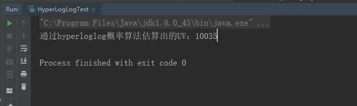 public class HyperLogLogTest { public static void main(String[] args) { //连接本地的 Redis 服务 Jedis jedis = new Jedis("localhost"); //初始化id为0-99的签到情况 IntStream.range(0, 10000).forEach((id) -> { String userId = UUID.randomUUID().toString(); jedis.pfadd("datetime:page1",userId); } ); System.out.println("通过hyperloglog概率算法估算出的UV:"+jedis.pfcount("datetime:page1")); } }