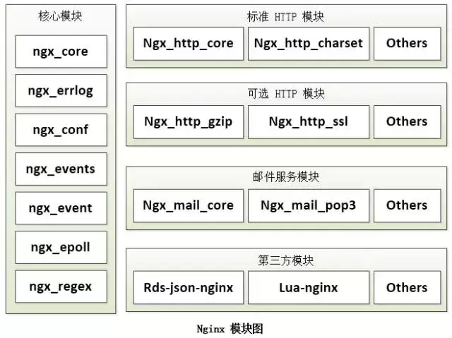 Nginx 的 worker 进程,包括 核心 和 功能性模块,核心模块 负责维持一个 运行循环( run-loop),执行网络请求处理的 不同阶段 的模块功能,比如:网络读写、存储读写、内容传输、外出过滤,以及 将请求发往上游服务器 等。而其代码的 模块化设计,也使得我们可以根据需要对 功能模块 进行适当的 选择和 修改,编译成具有 特定功能 的服务器。