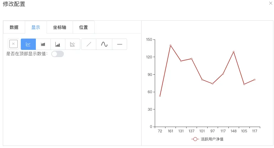 可选择图表类型,通过图表类型选择展示需要展示的图表。其中主要包括(折线、柱状、饼图、散点、雷达、表格、文字、数字、折线柱状组合图、柱状堆叠、漏斗、地图等类型)