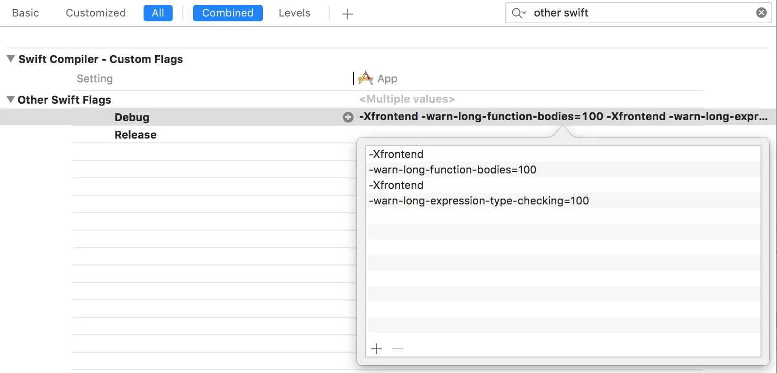 在 xcode => build settings => Other Swift Flags 添加下面设置,可以看到 swift 的表达式和函数的 类型检查的时长。并给出警告。