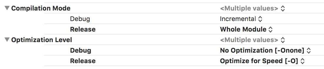 根据之前说法,把 swift 的文件合并成一个,可以大大减少编译时长。但是 xcode10 已经没用这个选项了。 xcode10 已经给出了优化的选择,我们主要选择正确的选项就可以,根据自己的需求,一般 debug 选择 增量编译,Adhoc 和 Release 可以选择模块编译