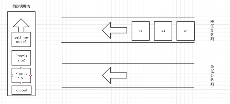 第一行遇到console打印process start!,继续向下执行遇到setTimeout,返回结果后(这里再次赘述一遍,返回结果可以理解为setTimeout里面第一个参数,也就是回掉函数)将其放入宏任务队列等待执行。 遇到setTimeout s3,返回结果后将其放入宏任务队列等待执行。 继续向下,遇到Promise,立即执行其构造函数,遇到setTimeout,返回结果后将其放入宏任务队列,因为s5等待时间是最长的,所以它也是最后一个放入任务队列,题主设置在了这个位置,当然各位也不要钻牛角尖,我们知道它是最后放入的就好,当然下面图可能一下看不懂,看不懂可以先看下面的,下面看完就懂了,如下图。 遇到console,立即在控制台打印8,遇到Promise立即执行其构造函数,遇到setTimeout s6,返回结果后放入宏任务队列。 遇到console打印9,遇到p2的resolve,将p2示例的then方法放入微任务队列。 遇到p1的resolve函数,将p1的then方法放入微任务队列,遇到console立即打印process end!。 到这里执行栈已经执行完毕,开始检查微任务队列,首先执行p2的then方法,将其加入执行栈,执行完毕后打印4,p2 then出栈。 接着执行微任务队列中p2的then方法,出队加入执行栈,执行后打印6,p1出栈。 微任务队列检查为空后,检查宏任务队列,取出s1执行,遇到console打印1,遇到setTimeout,将s2挂起,返回结果后加入任务队列。 遇到Promise p3立即执行其构造函数,遇到resolve方法后将其then方法加入微任务队列,p3执行完毕出栈。 s1函数执行完毕,出栈,执行栈为空,检查微任务队列,发现p3的then方法,将其放入执行栈执行,打印11,p3 then出栈,微任务队列为空。 检查宏任务队列,取出s3加入执行栈执行,打印2,遇到setTimeout将s4挂起,返回结果后加入任务队列。 遇到Promise p4立即执行其构造函数,遇到resolve方法后将其then方法加入微任务队列,Promise p4执行完毕出栈。 函数执行完毕,s3出栈,执行栈为空,检查微任务队列,发现p4的then方法,将其放入执行栈执行,打印12,微任务队列为空,p4 then出栈。 继续检查宏任务队列,发现s6,将其加入执行栈执行,打印7,执行完毕出栈。 执行栈为空检查微任务队列,微任务队列为空检查宏任务队列,发现s2,加入执行栈打印100,,执行完毕出栈。 执行栈为空检查微任务队列,微任务队列为空检查宏任务队列,发现s4,加入执行栈打印200,执行完毕出栈。 执行栈为空检查微任务队列,微任务队列为空检查宏任务队列,发现s5,加入执行栈打印3,执行完毕出栈,此时微任务队列宏任务队列都为空执行完毕!