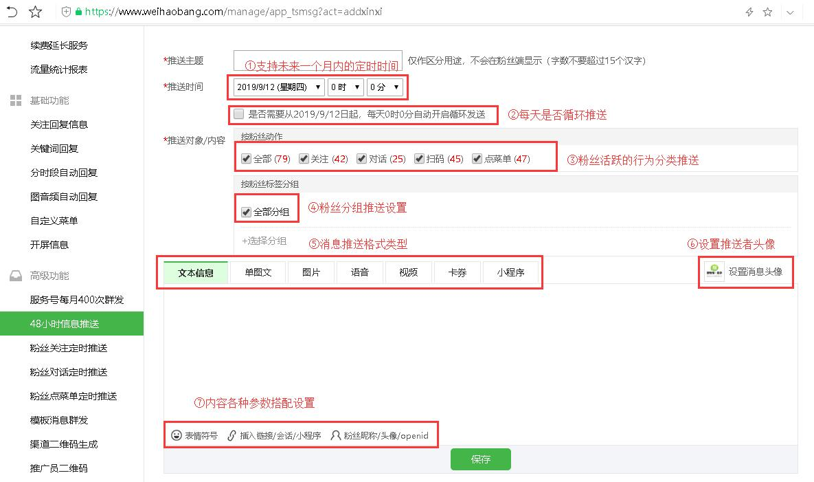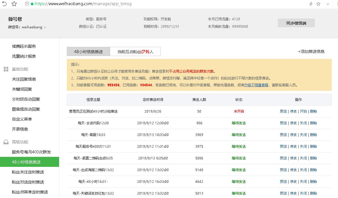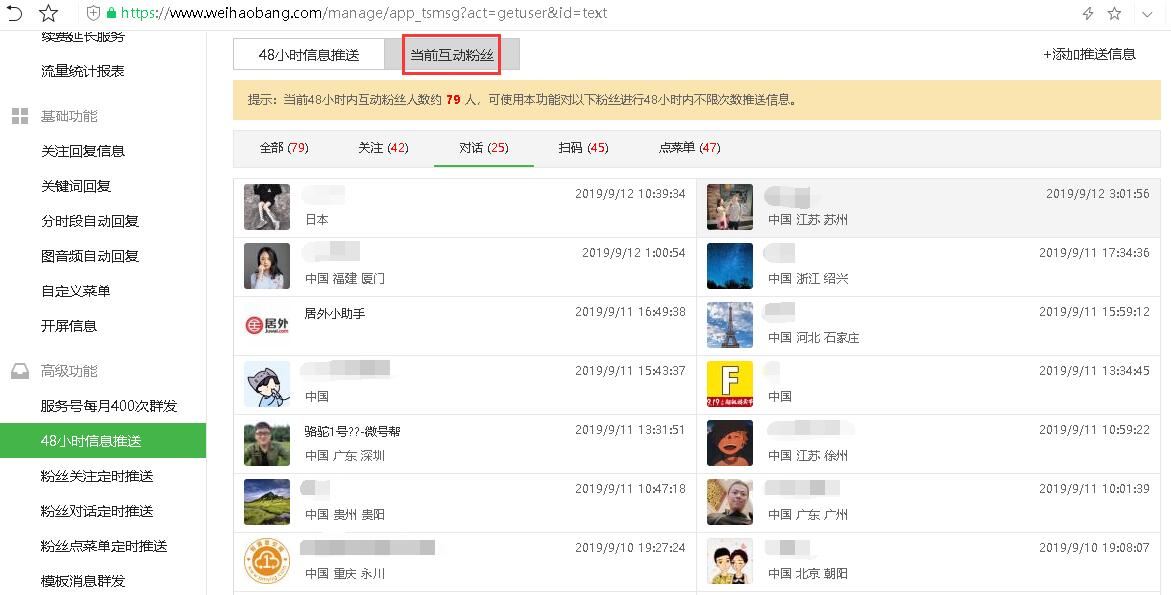 48小时推送信息功能,系统会自动统计互动活跃的粉丝,通过这个功能可以不限次数对粉丝推送消息。