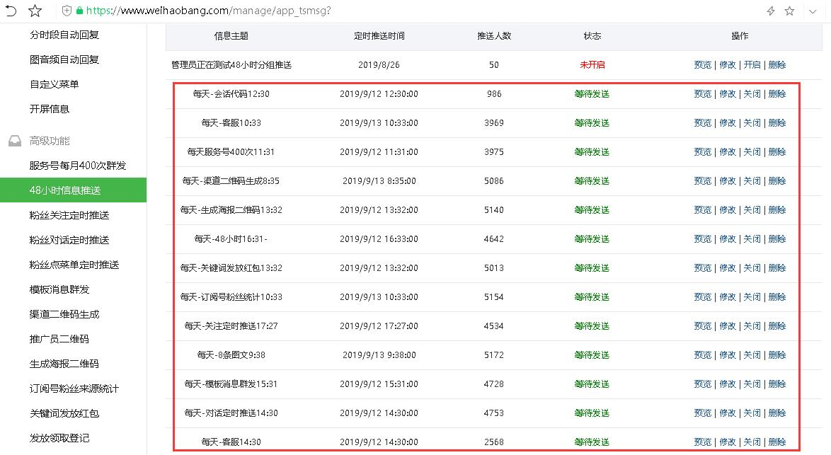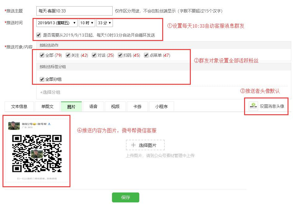 实例说明,48小时消息推送功能已设置好一个,每天10:33都是自动群发给活跃粉丝,系统自动统计活跃粉丝,无需人工手动发送。