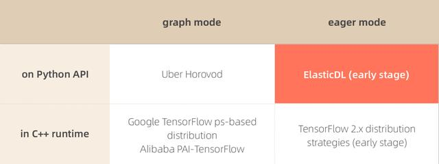 如上文解释,为了保证 TensorFlow 最核心的 runtime 是平台无关的,我们没 法通过修改 runtime 实现完备的主动的容错和弹性调度。所以如文首的田字格 所示,ElasticDL 和 Uber Horovod 都是在 TensorFlow 的 API 上包一 层。