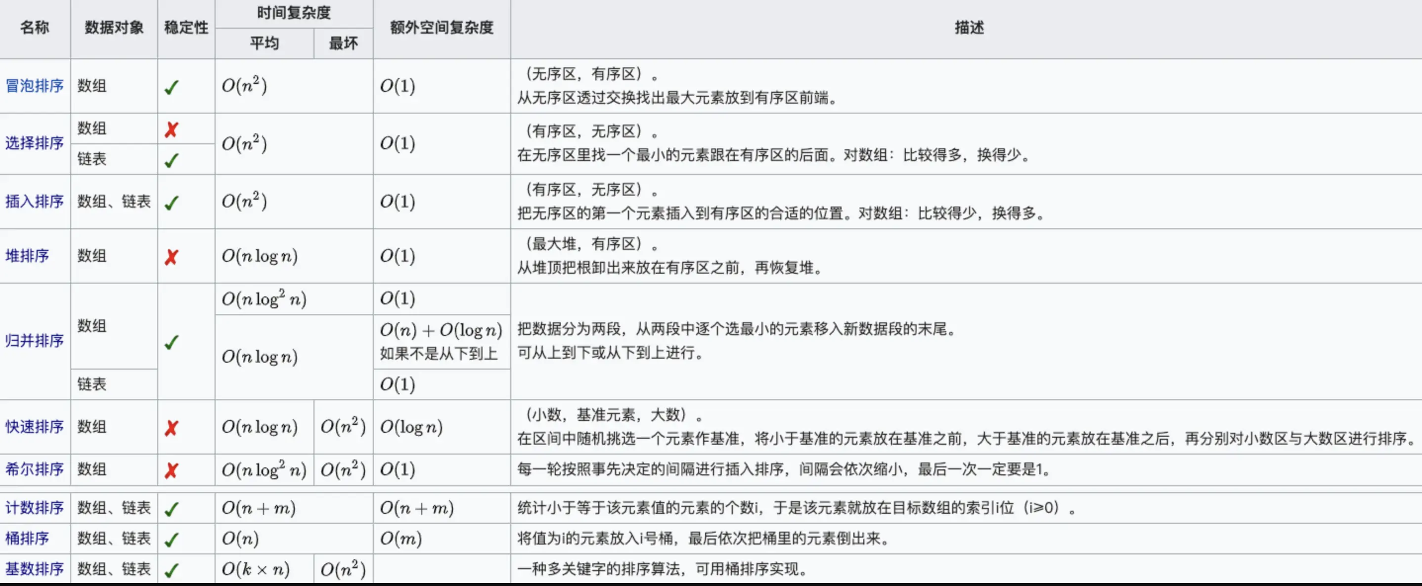 - 稳定性:排序后 2 个相等键值的顺序和排序之前它们的顺序相同