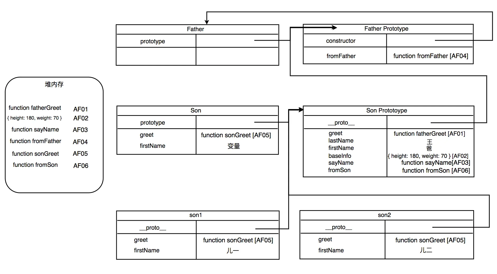 在代码{1}通过原型使 Son.prototype 指向 new Father 实例对象,从而实现继承。