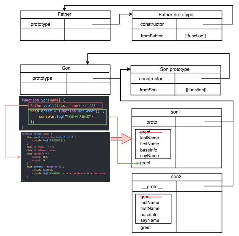 在构造函数 Son 中执行代码{1} ,借用构造函数 Father 实现对 Father 的继承。