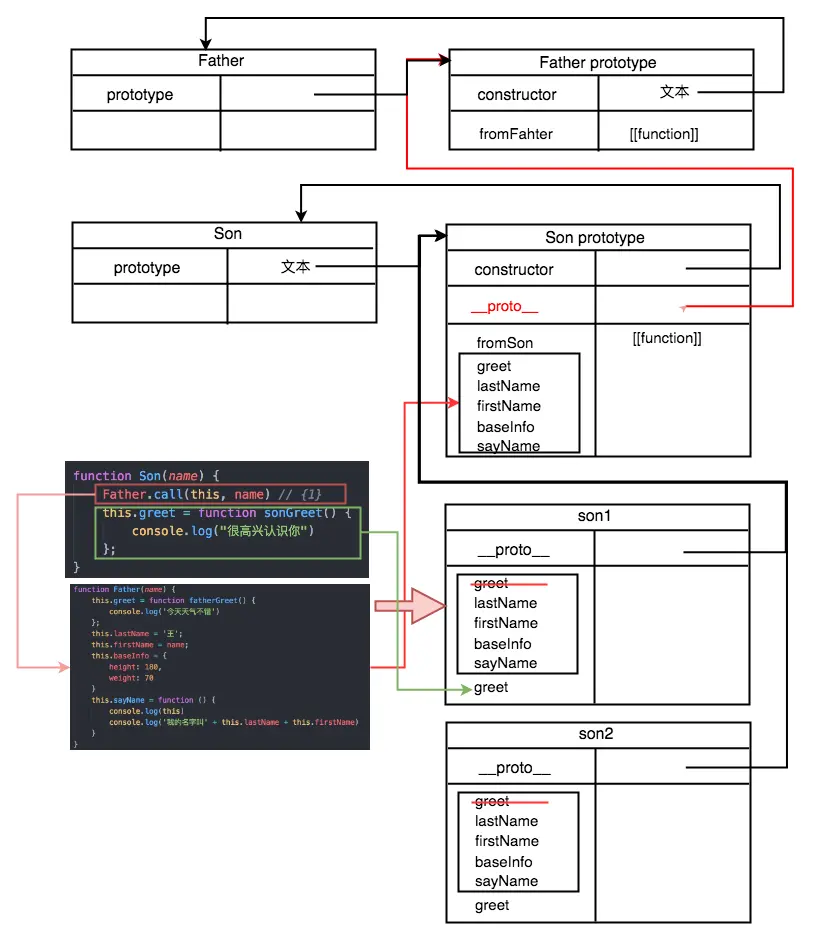 对比该图和借用构造函数继承,红线部分 Son.prototype.__proto__ 指向 Father.prototype,正是因为 Son.prototype = new Father(); //{2}。因而 son1.fromFather() 能够正常调用。
