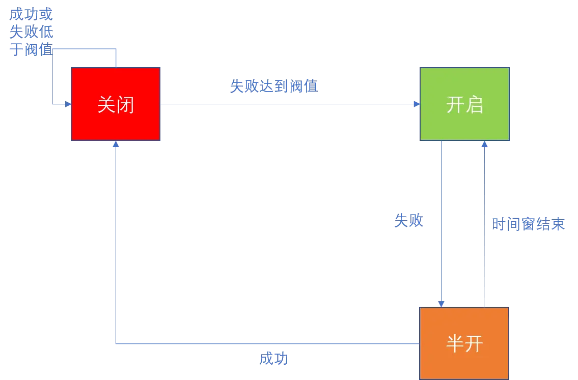 熔断器模式就像是那些容易导致错误的操作的一种代理。这种代理能够记录最近调用发生错误的次数,然后决定使用允许操作继续,或者立即返回错误。 Hystrix会有一个熔断时间窗口,具体转换逻辑如下: