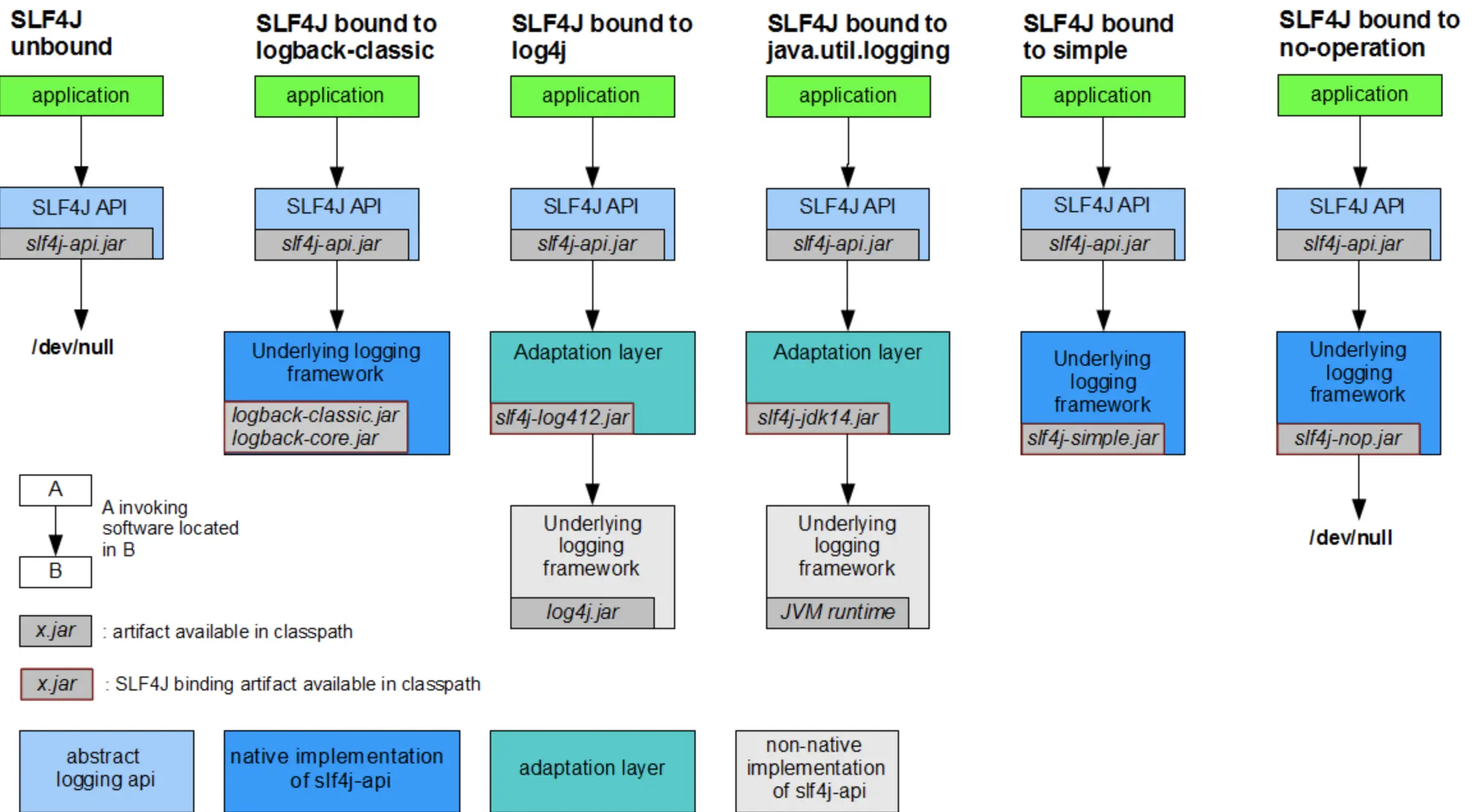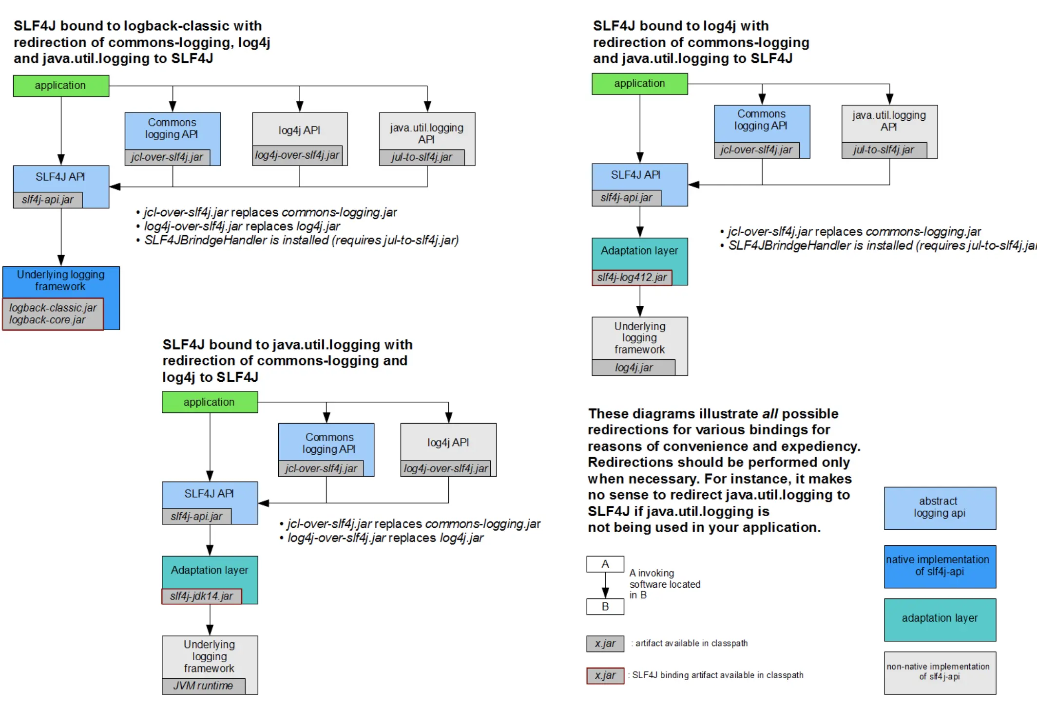 与commons loging(JCL)不同的是其采用在classPath加入桥接jar包来表示具体采用哪种实现(静态绑定)