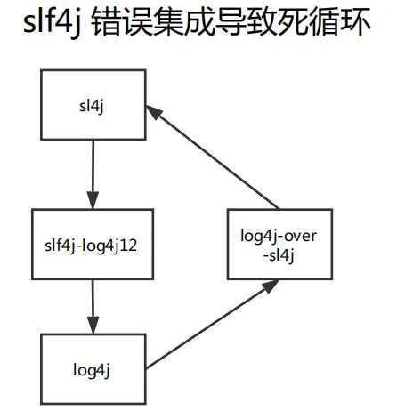 如上图所示,在这种情况下,你调用了slf4j-api,就会陷入死循环中!slf4j-api去调了slf4j-log4j12,slf4j-log4j12又去调用了log4j,log4j去调用了log4j-over-slf4j。最终,log4j-over-slf4j又调了slf4j-api,陷入死循环!