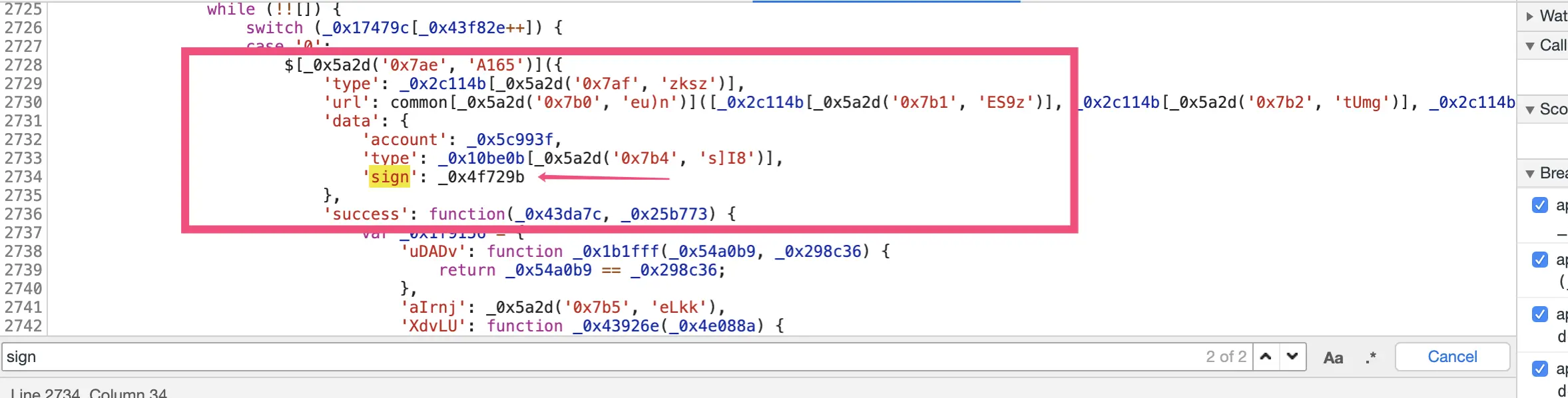通过抓包请求我们定位到了接口和加密参数,我们试着通过搜索sign关键字定位一下加密位置。
