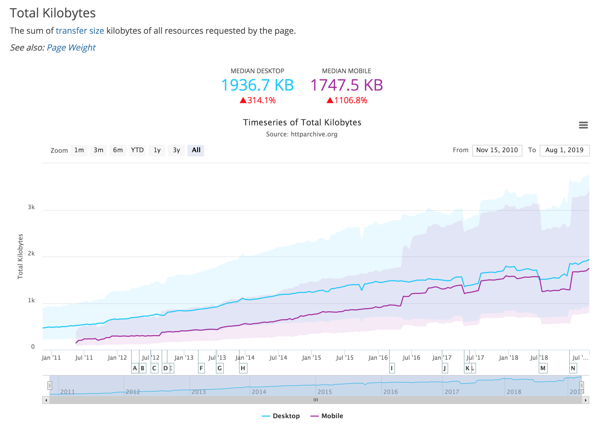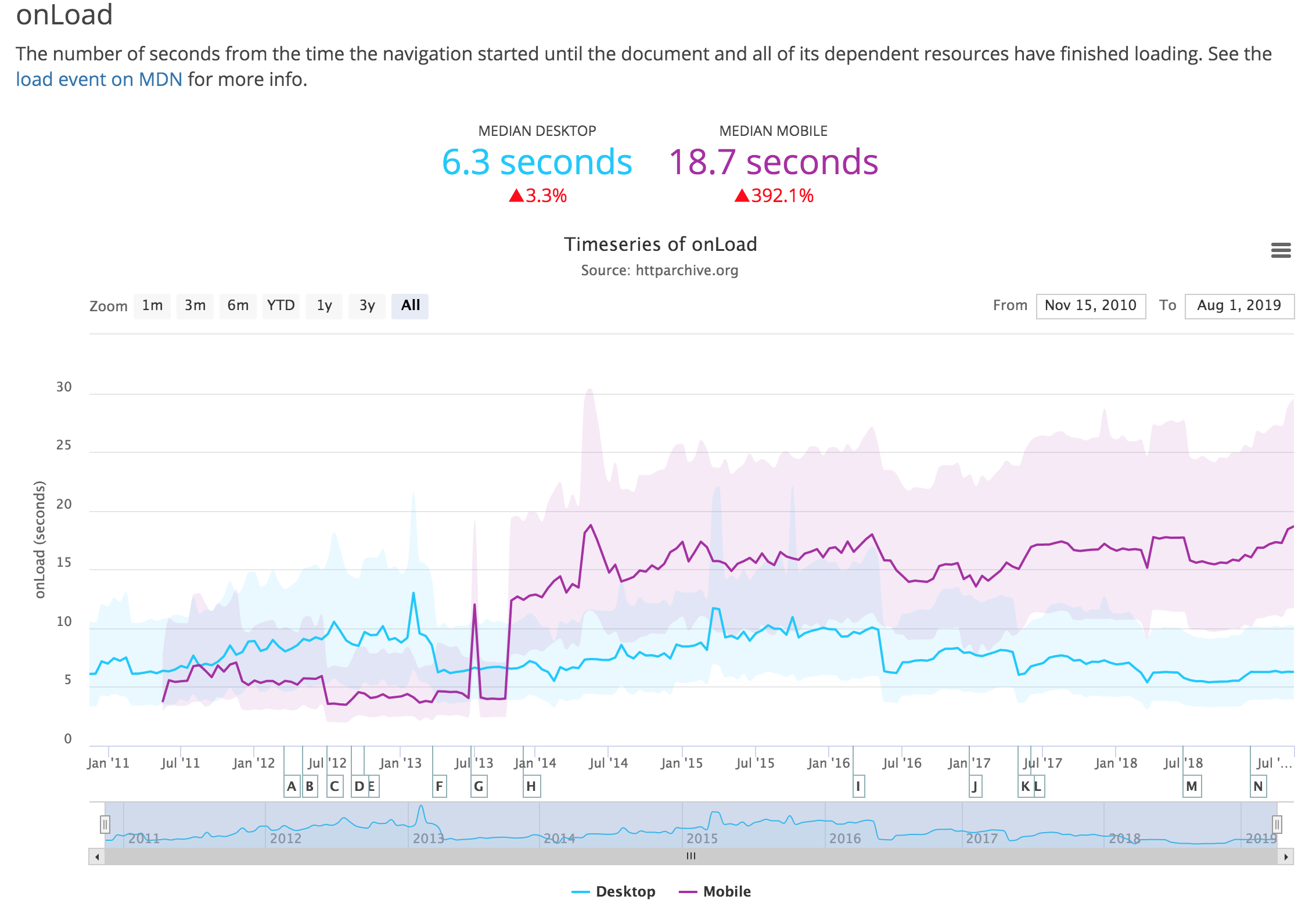 从2011年起,网站的总资源大小PC端增长了314%,移动端增长了1106%,而相应的页面加载onLoad的时间PC端增长了3.3%,移动端增长了392%。可以看到过去8年间,虽然网络环境得到了改善,但是由于移动网站的功能也越来越多,所以整体的加载时长其实是大幅度增加的。而且加载时长中位数达到了18.7s,这个对于终端用户而言几乎是不可用的状态。