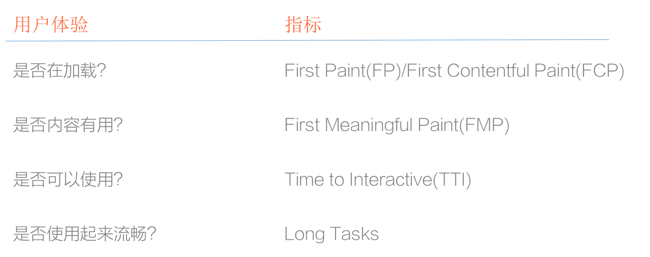 基于用户体验过程的性能指标往往才是关键的,一般分为以下几种体验: