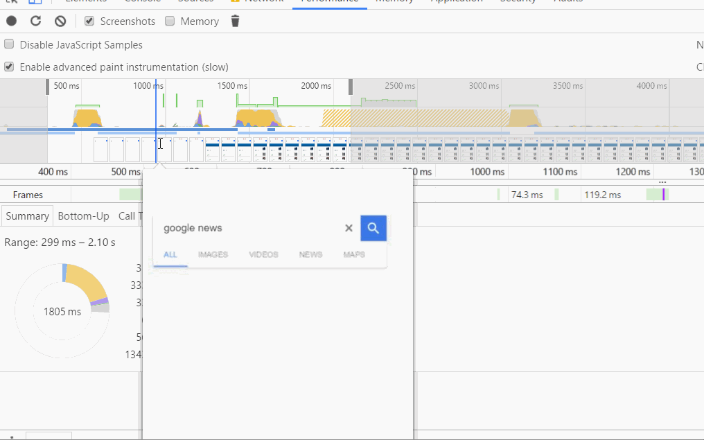 目标:在10ms或更短的时间内在动画中生成每个帧。从技术上讲,每帧的最大预算为16毫秒(1000毫秒/每秒60帧≈16毫秒),但浏览器需要大约6毫秒来渲染每帧,因此每帧10毫秒的准则。