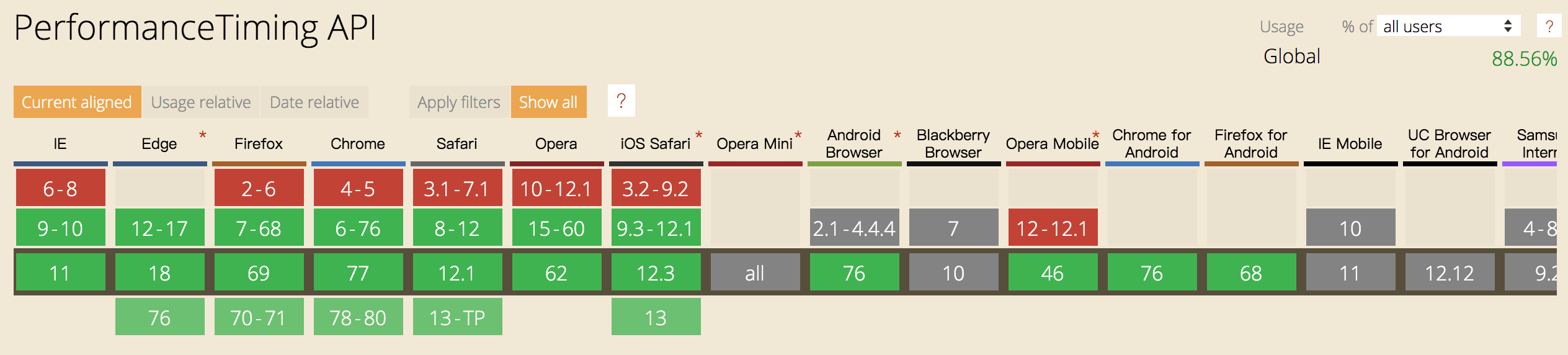 2012年W3C制定了Navigation Timing的标准,目前主流的浏览器都已经支持,通过window.performance可以获取页面加载过程中各个阶段的时间点,从而可以采集到真实用户的性能数据。