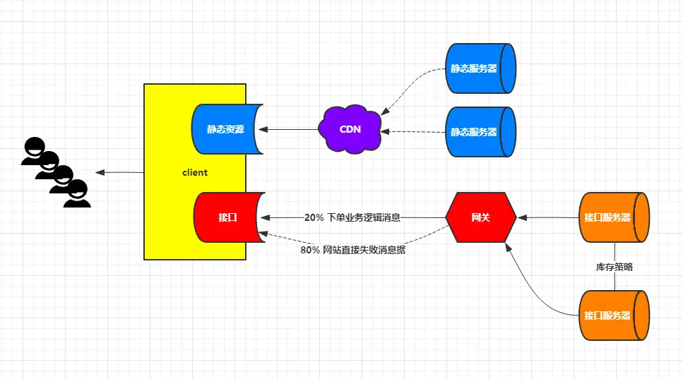 - 网关总有限流功能吧,按需把80%流量直接返回抢购失败消息,20%流量正常进入秒杀策略