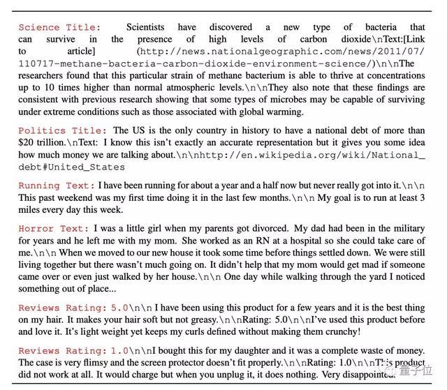 值得一提的是,CTRL的训练文本数据多达140GB,包括维基百科,Gutenberg上的书籍,OpenWebText2数据集(GPT-2网页文本数据集克隆版),大量新闻数据集,亚马逊评价,来自ELI5的问答,以及包括斯坦福问答数据集在内的MRQA共享任务等等等等。