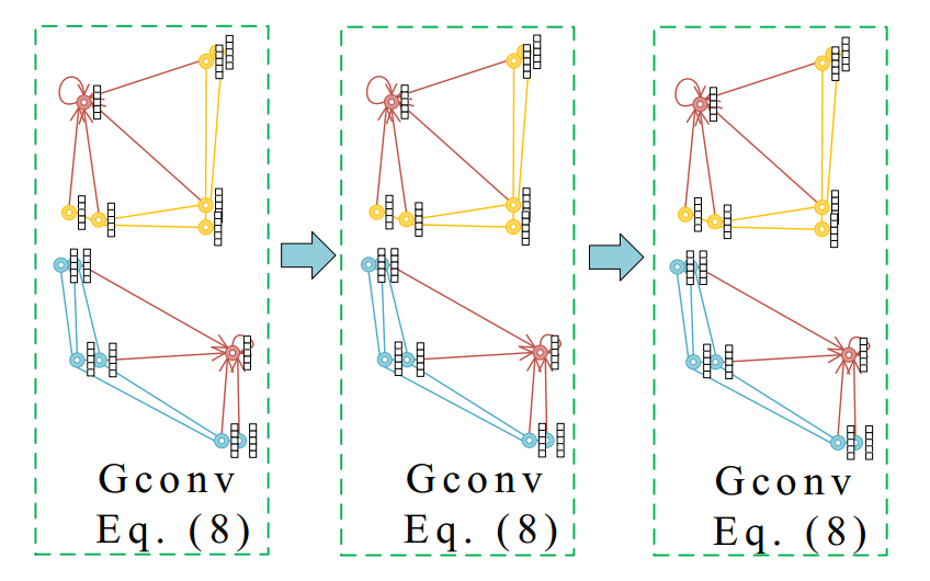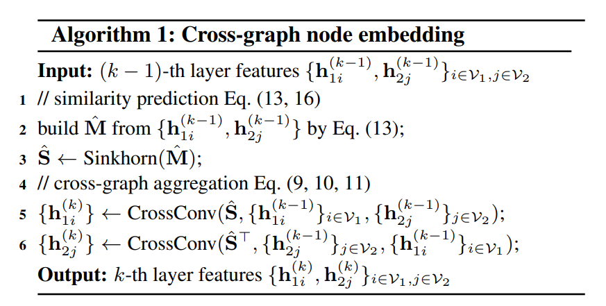 基于图内卷积,作者进一步提出了跨图卷积CrossConv的形式。跨图卷积在两个待匹配的图结构之间传递特征,如图 3所示。