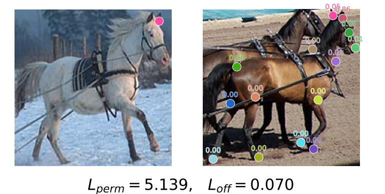 在实验中,作者证明,基于交叉熵的排列损失函数能够为模型提供更精确的监督信息。在图 4所示的对比中,排列损失函数的优势被具象地阐述:图 4中,粉红色标注的两个节点(马的左耳)代表真实的匹配关系。右图中,每个节点上方的数字代表模型预测当前节点与左图粉红节点匹配的概率。在这次不理想的预测中,右图中的真值节点(右图中的粉红色节点)只获得了0.05的概率。然而,基于像素偏移的损失函数为这次预测给出了一个相当低的损失值(只有0.070);作为对比,排列损失函数能够给出一个较高的损失值(5.139)。显然,排列损失函数为模型训练提供了更加准确的监督信息。