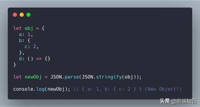 我们无法复制自定义的对象函数,以及键对应的值是undefined 或 Symbol的情况,如下: