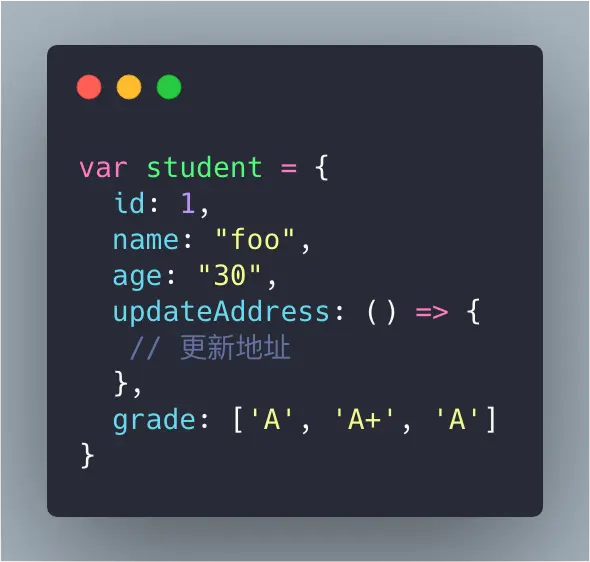 例如,如果您的对象是学生,则它将具有名称,年龄,地址,ID等属性以及updateAddress,updateName等方法。
