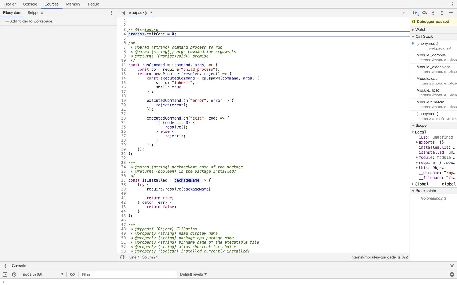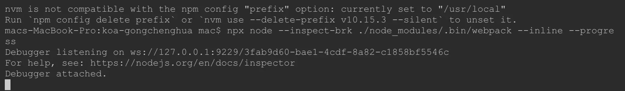 npx node --inspect-brk ./node_modules/.bin/webpack --inline --progress