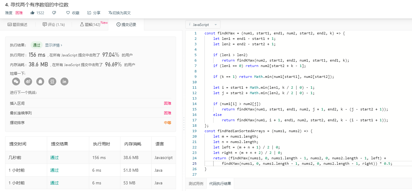 将问题一般化就是获取第k个数,取两个数组中第k/2个数进行比较,如果比较小,就把这个数组的前k/2个元素全部剔除,依次循环,直到k为1或者有一个数组为空。