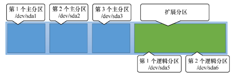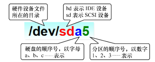 由于现在的 IDE 设备已经很少见了,所以一般的硬盘设备都会是以“/dev/sd”开头的。 在一台主机上通常可以安装多块硬盘,系统采用 a~p 来代表 16 块不同的硬盘(默认从 a 开始分配)。一块硬盘中的分区也有如下特点: