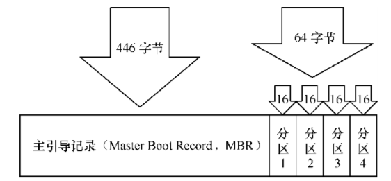 最后在此小节中简单记录一下和分区有关的基础知识。硬盘设备是由大量的扇区组成的,每个扇区的容量为 512 字节。其中第一个扇区最重要,它里面保存着主引导记录与分区表信息。就第一个扇区来讲,主引导记录需要占用 446 字节,分区表为 64 字节,结束符占用 2 字节;其中分区表中每记录一个分区信息就需要 16 字节,这样一来最多只有 4 个分区信息可以写到第一个扇区中,这 4 个分区就是 4 个主分区。如下图所示: