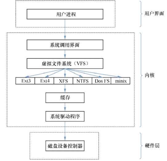 用户在硬件存储设备中执行的文件建立、写入、读取、修改、转存与控制等操作都是依靠文件系统来完成的。文件系统的作用是合理规划硬盘,以保证用户正常的使用需求。像 Ext3 、 Ext4 、 XFS 都是较为常见的文件系统,其中 XFS 是 RHEL7 中默认的文件管理系统。另外,为了使用户在读取或写入文件时不用关心底层的硬盘结构,Linux 内核中的软件层为用户程序提供了一个 VFS(Virtual File System,虚拟文件系统)接口,这样用户实际上在操作文件时就是统一对这个虚拟文件系统进行操作了。如下图: