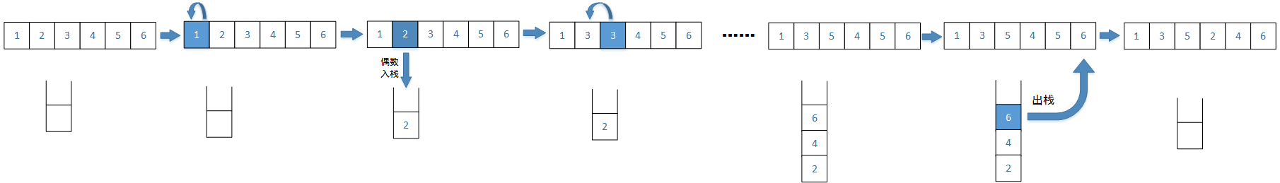 - 首先建立一个栈,用于存储偶数;然后遍历原数组,遇到奇数则按顺序重新为原数组赋值,遇到偶数则压入栈;最后将栈中的偶数弹出,并依次从原数组最后一个元素开始赋值。