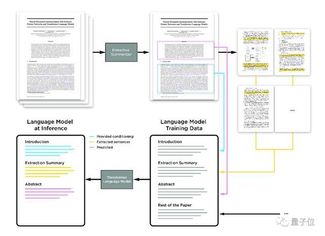 为了处理超过几千个单词的超长文档,他们先使用两个不同的分层文档模型对句子进行提取,一个基于指针网络,另一个基于句子分类器,这样的结构保证在生成摘要前更好地调整Transformer语言模型的相关信息。