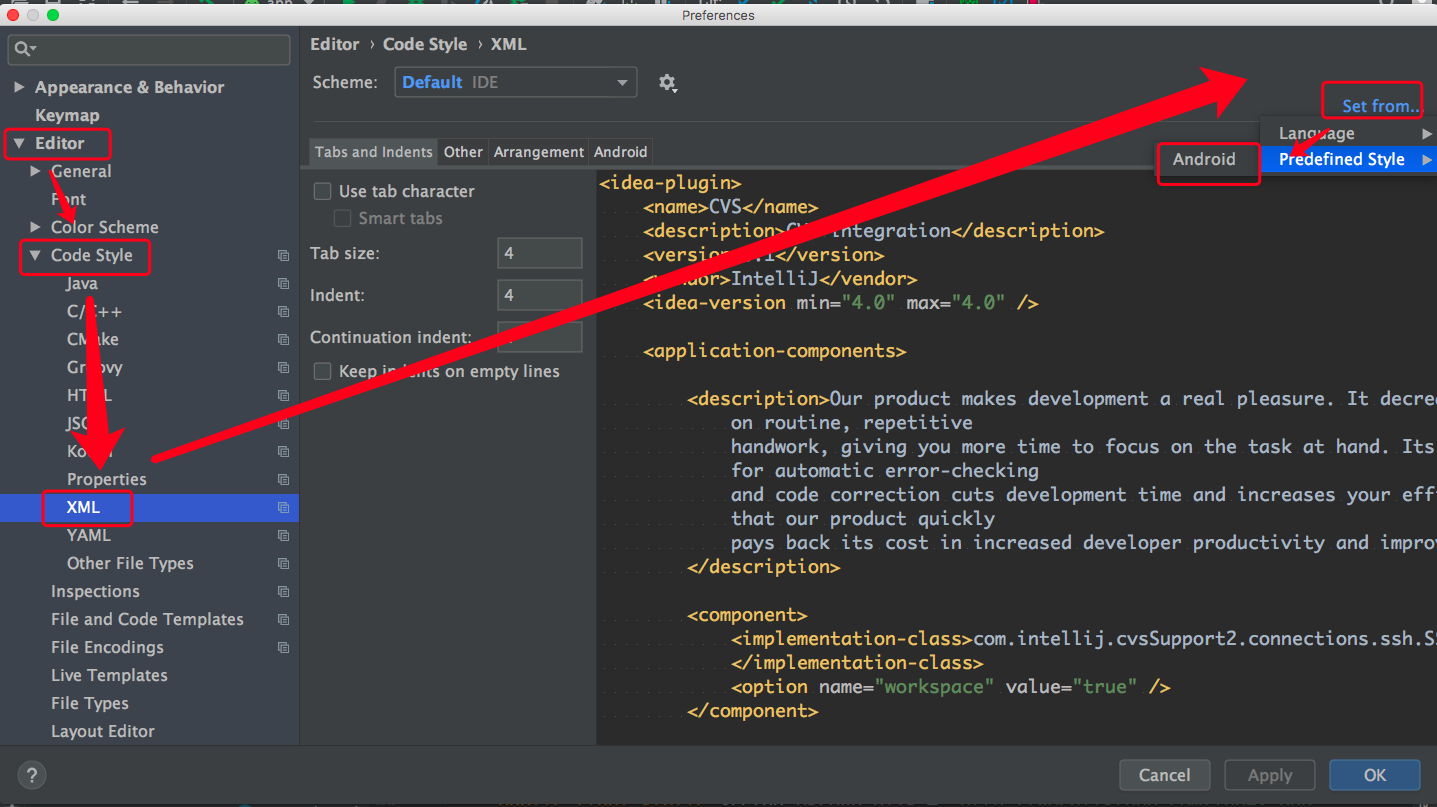 解决 android studio 3.5 格式化 xml 文件后 view 布局错乱的问题 已注销 2019-09-14 990 阅读1分钟 android studio 3.5 修复了很多bug,体验上也流畅多了。但是有个不好的地方,xml 布局文件格式化后会将控件的位置打乱,导致视图显示有问题。 解决办法: 打开设置,Editor => Code Style => XML => 点击右上方的 Set From => Predefined Style,然后选择 Android,保存即可。