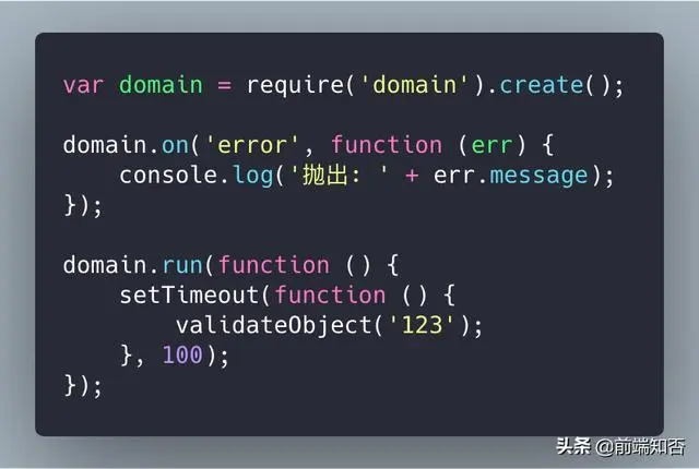这是一个常用的模式,函数执行时,如果出现错误情况,它会直接抛出一个错误。错误异常需要在catch中捕捉并处理。在try / catch中无法处理异步方法调用抛出的错误。要解决这个问题,我们需要使用domains。在node v0.8+版本的时候,发布了一个模块domain。这个模块做的就是try...catch所无法做到的:捕捉异步回调中出现的异常。